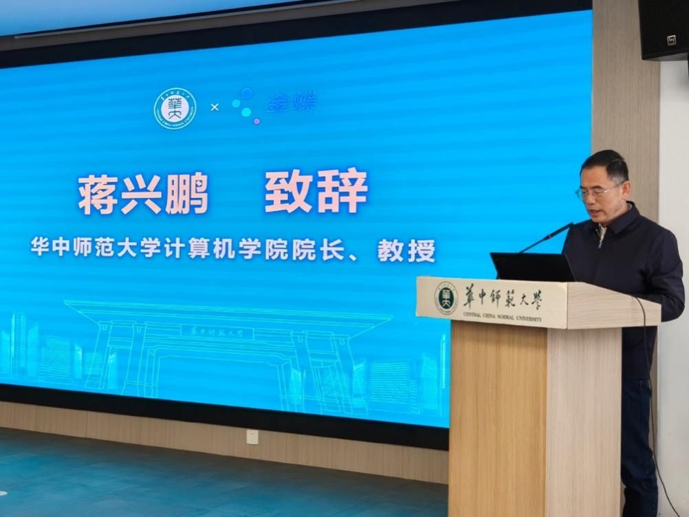 蒋兴鹏在致辞中指出,金蝶软件作为全球领先的企业管理云 SaaS 服务商,自 1993 年成立以来,在企业数字化领域取得显著成就,拥有六项“唯一”荣誉,旗下金蝶云・苍穹等产品已为全球超过 740 万家企业及组织提供服务。华中师范大学作为“双一流”建设高校,计算机学院已构建完整的博士学位授权体系,并承担国家工程硕博士培养改革专项试点任务。他强调,双方合作将有力推动“新工科”建设,为跨学科创新注入新动能。