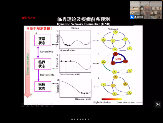 陈洛南教授还详细介绍了复杂疾病系统发生发展过程的临界理论,指出疾病的发病过程呈现从发病前可逆到发病后不可逆的非线性状态。陈洛南教授引入了动态网络标志物DNB(DynamicNetworkBiomarker),通过临界理论实现基于观测数据完成预警的效果。