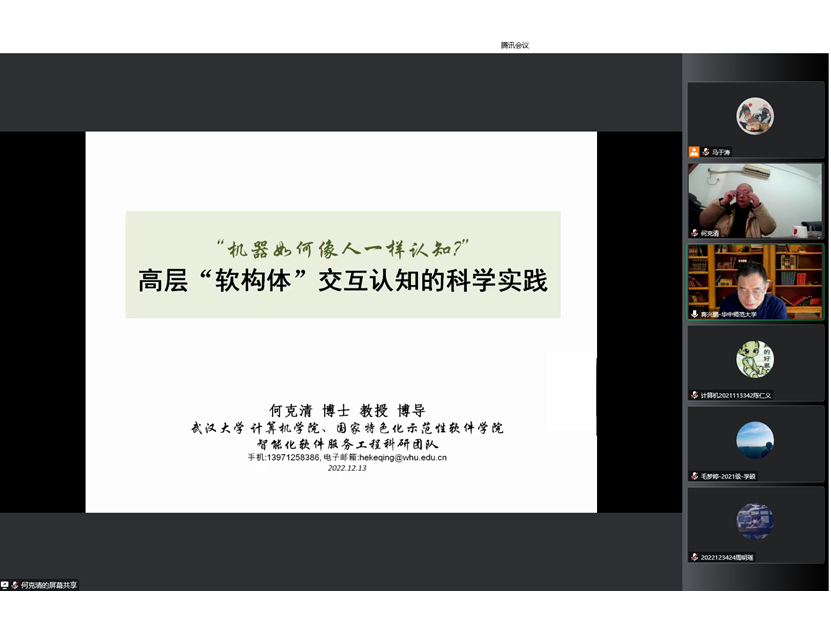 2022年12月13日上午,武汉大学计算机学院何克清教授应马于涛教授的邀请,做客我院第六期“南湖学者论坛”,通过腾讯会议平台在线为师生作了题为《高层“软构体”交互认知的科学实践》的学术报告。