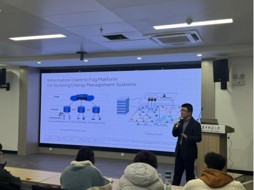 在报告中,Jiong Jin副教授基于实时物联网在智慧城市中的应用,由具象到整体,介绍了边缘计算(Edge Computing)和雾计算(Fog Computing)有效结合的多级计算方案,即将计算任务分布在从云到物的多级节点中,以弥补云计算的方法。随后,他依次具体地介绍了用于建筑能源管理系统的协作雾平台和边缘计算架构,用于智能交通控制场景的实时物联网应用,实现云雾自动化的驱动技术、研究方向和必要挑战等研究工作。最后,Jiong Jin副教授以自己的研究经验对现场师生的提问进行了针对性的回答,给在座的师生提供了开放视角和研究思路。
