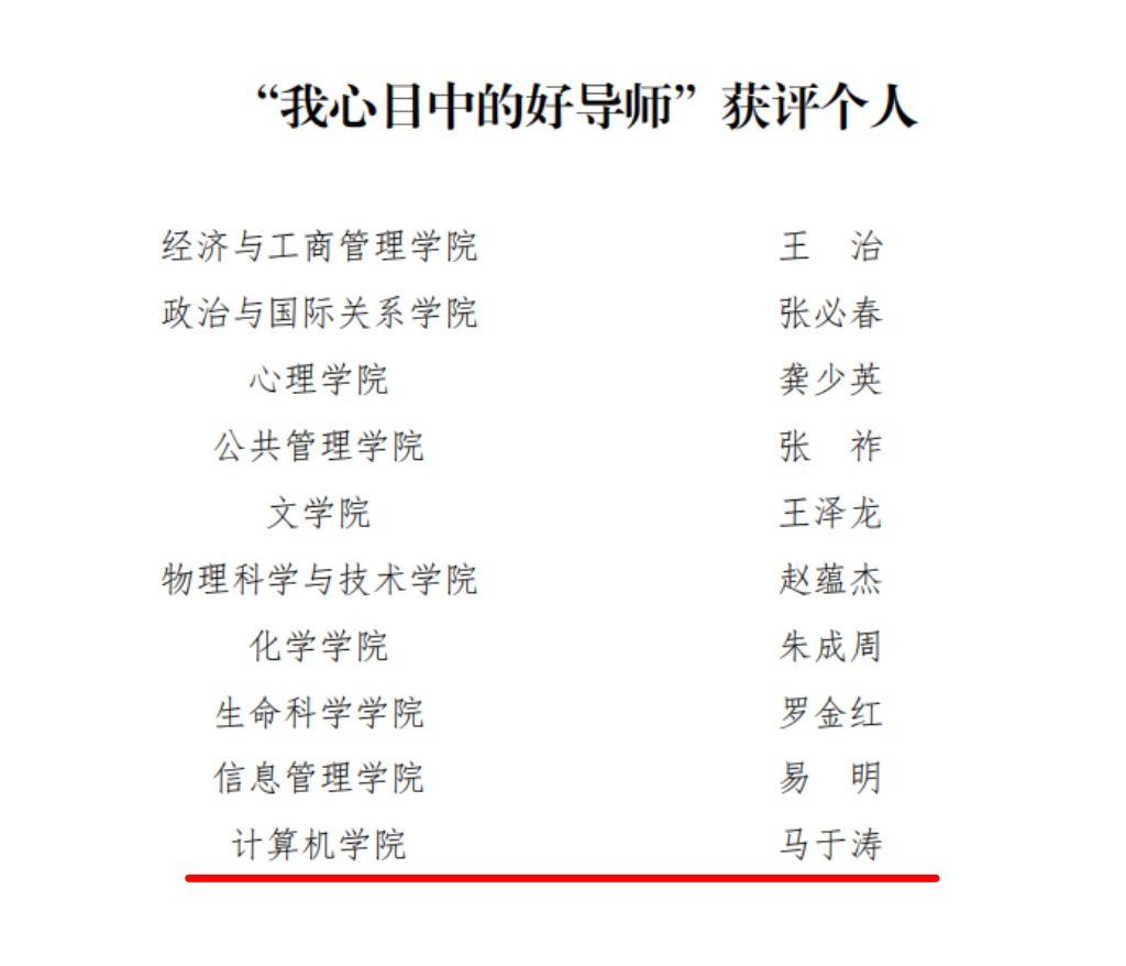 根据《关于表彰 2025 年“我心目中的好导师”和“好导师团队”获评导师(团队)的决定》(华师行字〔2025〕51 号)文件内容,经各培养单位推荐,学校材料审核,专家评审会评选,校长办公会议审定,共产生 2025 年“我心目中的好导师”10 名和“好导师团队”5个。其中,我院马于涛教授获评“我心目中的好导师”。