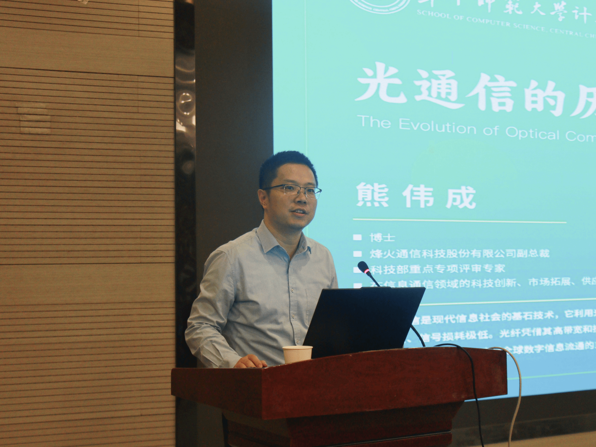 熊伟成以“光通信的历史发展”为主题展开深度分享。他首先明确了光纤通信的核心定义,并通过与铜缆的对比,系统阐述了光纤在传输距离、抗干扰能力、重量及材料来源等方面的显著优势。随后,他重点介绍了光纤通信技术演进的三条主线:传输带宽与容量的持续提升、业务承载效率的不断优化,以及网络效率与灵活性的逐步增强。