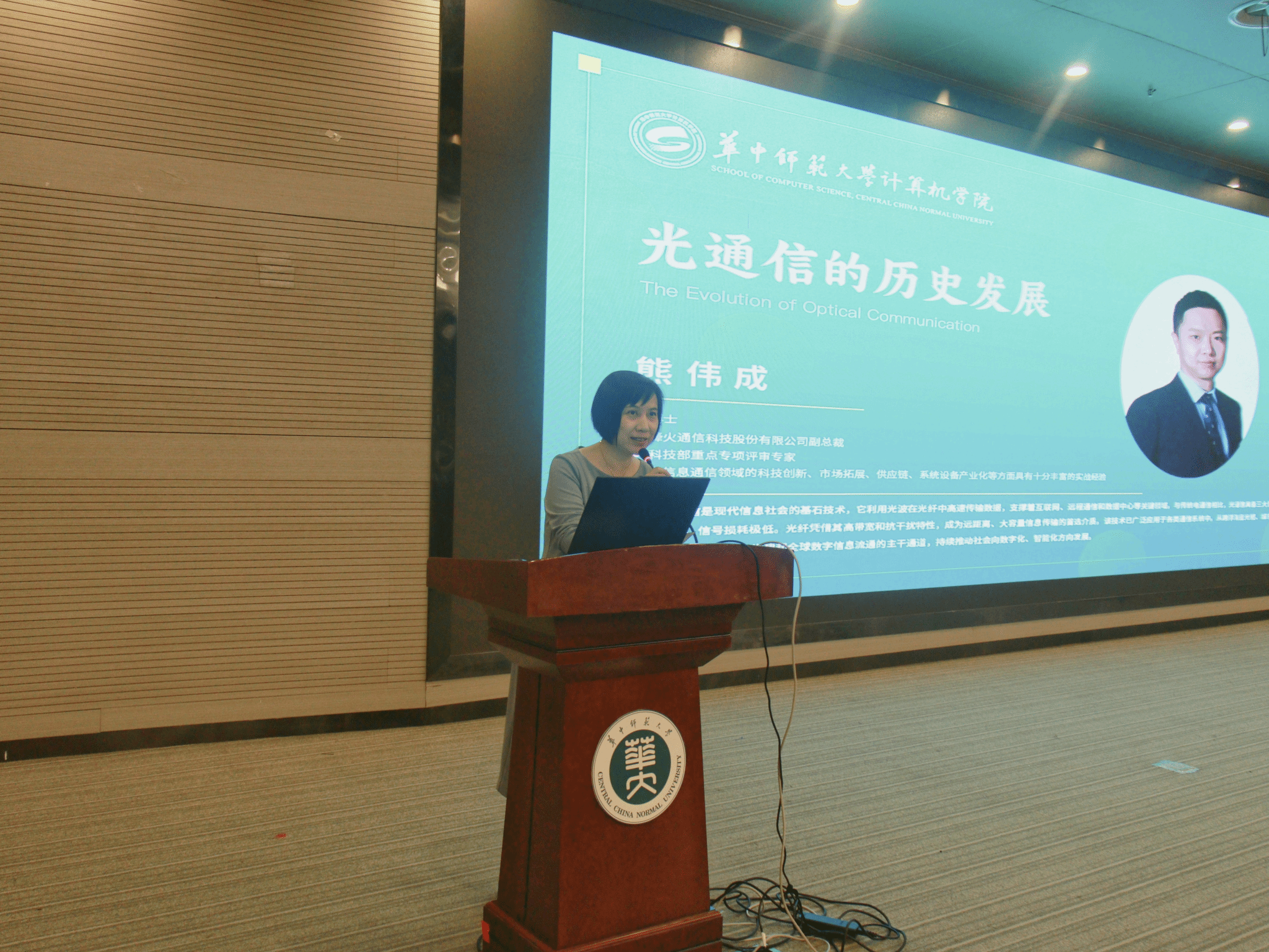 计算机学院记者团讯(通讯员 宋佩琪 孟圣嘉 田俊楠 刘峻滔 编辑 欧阳嘉蕙 陈雯潓 李逸飞)10月15日下午,华中师范大学计算机学院第六期“南湖论坛”在南湖综合楼一楼学术报告厅顺利举行。本期论坛特邀烽火通信科技股份有限公司副总裁、科技部重点专项评审专家熊伟成博士担任主讲嘉宾,计算机学院副院长崔建群教授主持本次论坛。