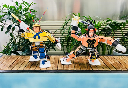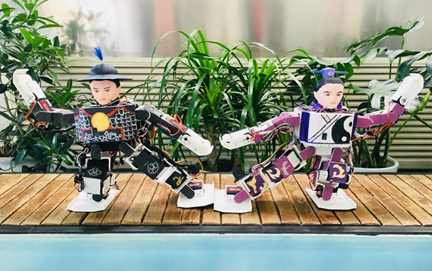 今年的机器人大赛,学院的团队在继承和发扬以往“讲故事”的形式之上,选取了中国传统文化中的经典文学作品作为创意来源。双足人形项目取材于《西游记之火焰山》和《太极张三丰》的故事。孙悟空作为人们熟知的形象,实验室同学们在前几届“真假美猴王”作品的基础上,采用99年动画片中孙悟空的形象,希望展示一个不一样的孙悟空。在细节方面,队员们通过多次尝试设计出了可以伸缩的如意金箍棒,并考虑到芭蕉扇在故事中的重要作用,实现了对假扇与真扇的手部拿捏设计,既重视了原作又能起到很好的文化传承与教育作用。