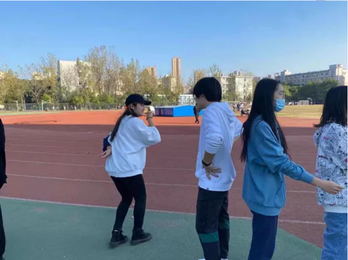 其中,第一个游戏“爱的抱抱”由全体同学一起参与,将女生和男生分别设置为面额为1元和5毛的钞票,同学们伴随着音乐绕圈,当主持人喊出随机的面额,参与人员就要以面额为准抱在一起,落下的成员则被淘汰,以此决定各个队伍在随后游戏的出发顺序。另外,游戏“言行一致”也颇为有趣,将每队六名成员分成三组,二人一组,一名成员带上眼罩,在其面前设置障碍,另一名成员指挥他的队友,顺利通过障碍,途中不可碰到障碍物,考验了成员之间的默契与配合。在彼此配合之下完成游戏,即使是偶然的失误也带来了欢声笑语,同学们获得了良好的游戏体验。