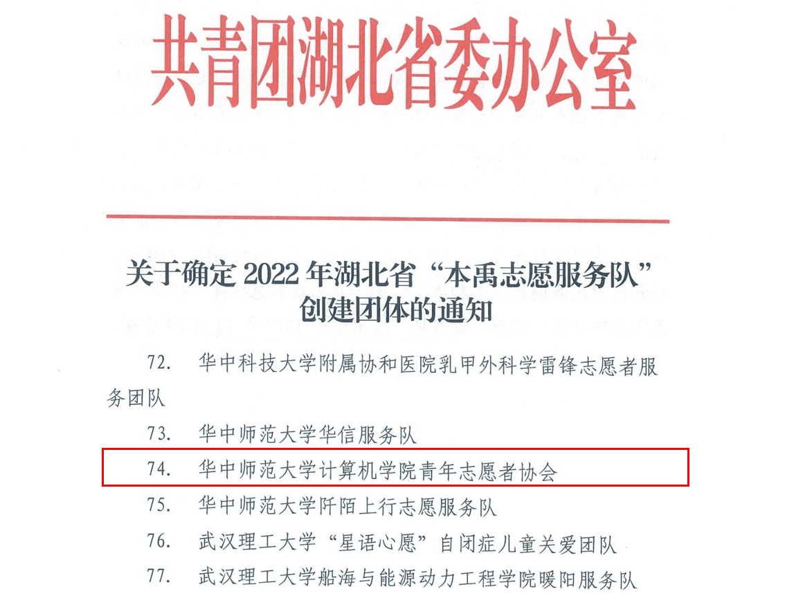 计算机学院记者团讯(通讯员 谭婷婷)近日,经学校推荐、初审、省“本禹志愿服务队”评审委员会考察评审,共青团湖北省委、湖北省志愿者协会公示了2022年湖北省“本禹志愿服务队”名单,我院青年志愿者协会荣列其中。