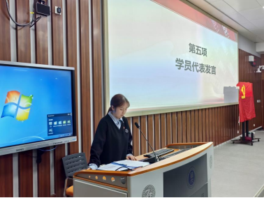 计算机学院本科生党支部预备党员吕洵作为学员代表发言。她代表全体学员向党组织作出承诺:学习上全力以赴,以最饱满的热情投入到培训中;思想上坚定信念,不断提升思想觉悟;行动上积极参与实践,争做先锋模范。
