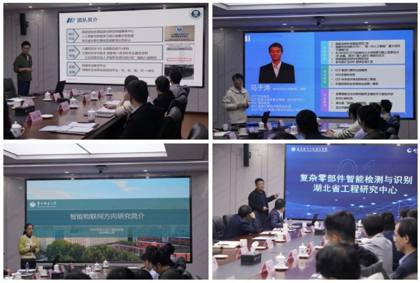 我院陈嘉耕老师、马于涛老师和常亚楠老师分别介绍了学院在信息安全、智能制造和工业机器人、智能网络方面的研究内容和成果,武软机械工程学院院长蒋保涛也进行了专业研究阐述,共同探讨科研合作的新机遇与挑战。