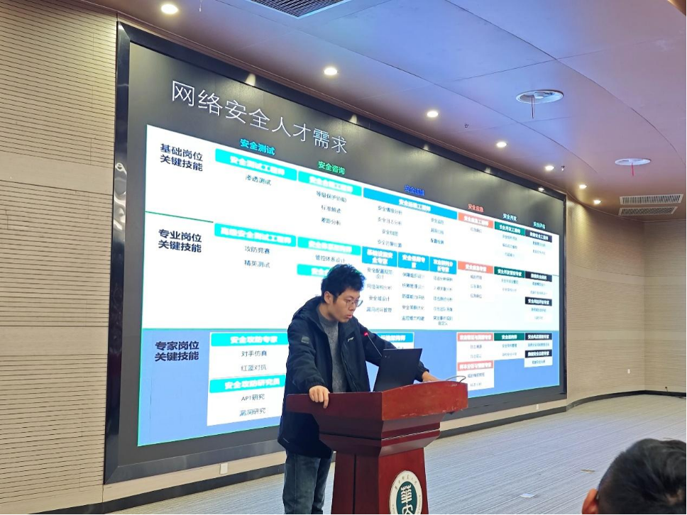 陈嘉耕首先展示了信息安全系在密码学、应用密码学、区块链技术和人工智能等领域的卓越教学和研究成果,并指出在国家战略、人才需求和市场前景的推动下,信息安全专业具有广阔的发展空间。他特别强调了实操经验在信息安全专业人才培养中的关键作用,并介绍了学院在这一方面的优势:通过CTF实训在线学习平台、攻防竞技靶场和仿真场景演练靶场等建设,极大地提升了学生的实战能力。此外,陈嘉耕还提到,“本科生进实验室计划”作为一个优质科研平台,为学生提供了宝贵的科研机会。