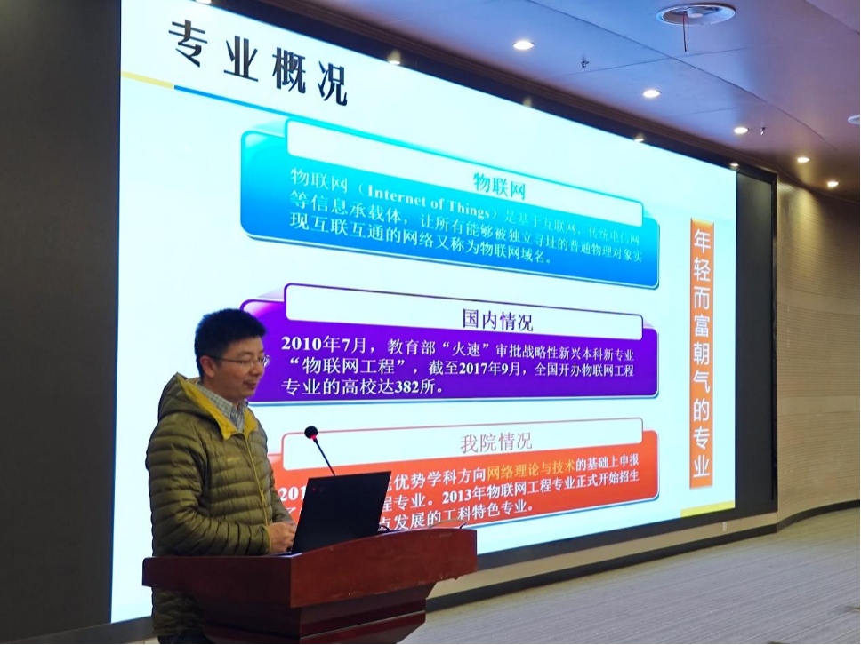 姚华雄从国内发展和学科交叉的角度,分别将物联网专业解读为“年轻而富有朝气的专业”和“新兴战略性产业”。他介绍了学院在课程体系、师资力量和实验室资源等方面的建设,并通过竞赛成果、物联网协会项目、小米物联网联合实验室及百度Apollo智能驾驶平台等展示了专业建设的成效。最后,他以“能文能武,软硬兼施”总结了专业优势,并表达了对物联网人才培养的期望。