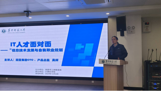 12月6日,由党委学生工作部就业处主办,计算机学院承办的“IT人才面对面”——信息技术发展与自我职业规划讲座在南湖综合楼N7119顺利举行。超星集团CTO、产品总监吴辉、职员陈最,计算机学院党委副书记庄甲鹏、辅导员孙煜林以及来自各学院的80余名学生共同参与。本次活动由庄甲鹏主持。