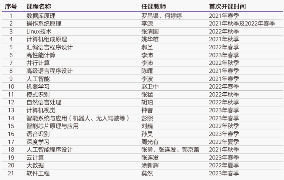 我校与华为联合课程开发和教学,共计开发了《人工智能》、《云计算》等21门课程(如图1)。这些课程一方面在现有课程体系中引入了深度学习、自然语言处理、计算机视觉等前沿教学内容,另一方面将鲲鹏、昇腾和华为云的知识点与现有的课程(比如“数据库”、”云计算”)相融合,将openGauss数据库、鲲鹏处理器等先进技术融入核心课程,推进课程的“理论课”和“实验课”教学改革,更新“理论和实验教学大纲、教学PPT、实验指导”等教学资源,提升核心课程中华为技术方案的教学与实践质量。