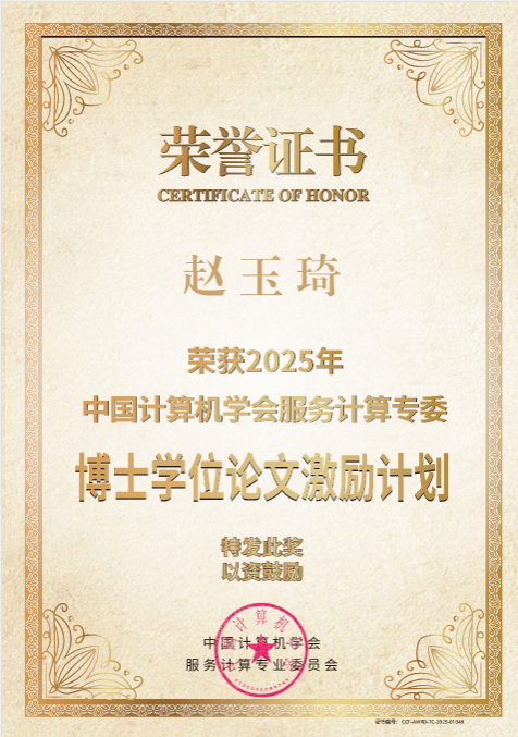 2025年8月19日至21日,由中国计算机学会(CCF)主办的CCF 2025中国数字服务大会在山东烟台隆重召开。会议期间,CCF服务计算专业委员会公布了“博士学位论文激励计划”获奖名单,我院软件工程系青年教师赵玉琦荣获该项荣誉。
