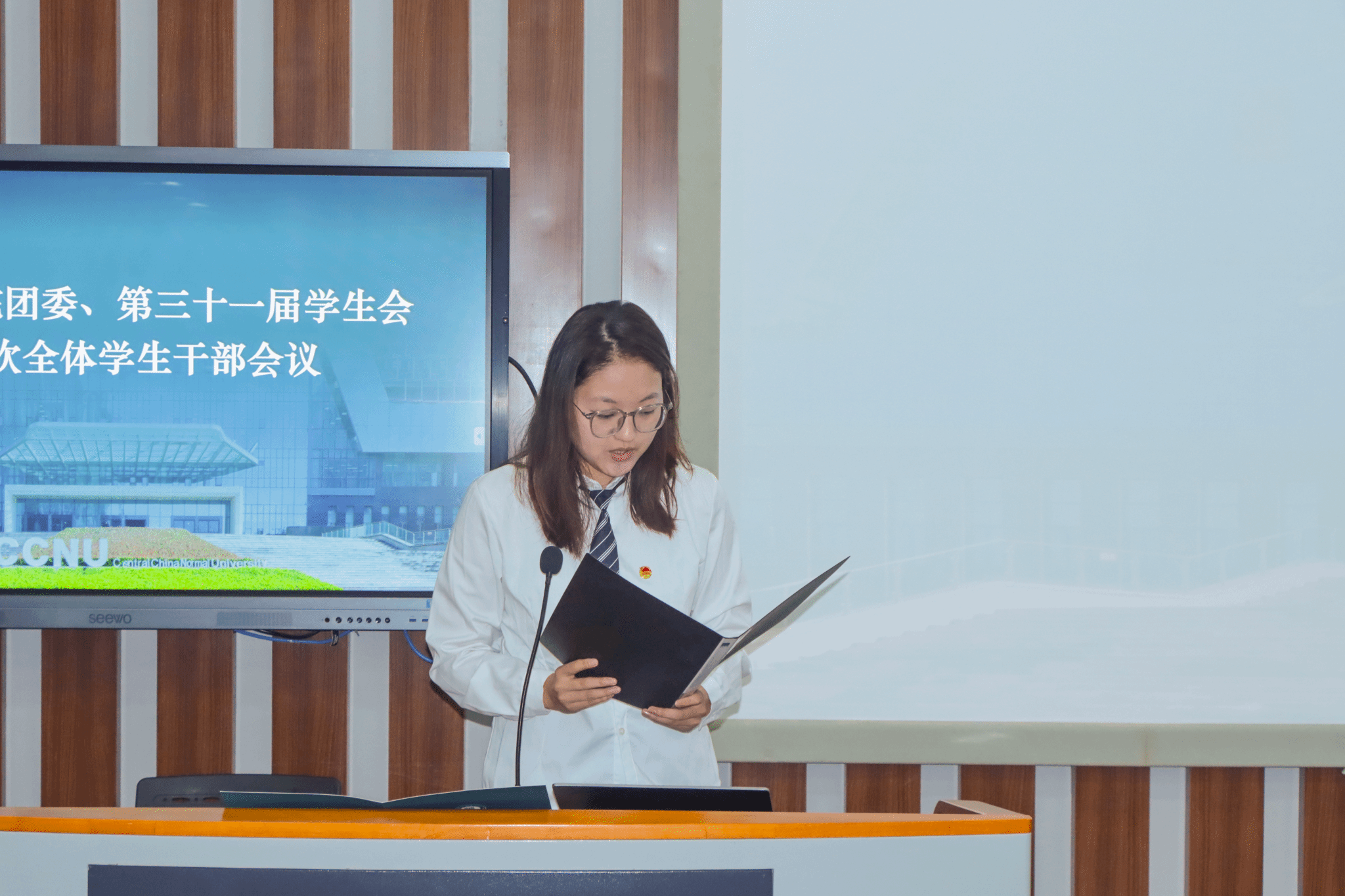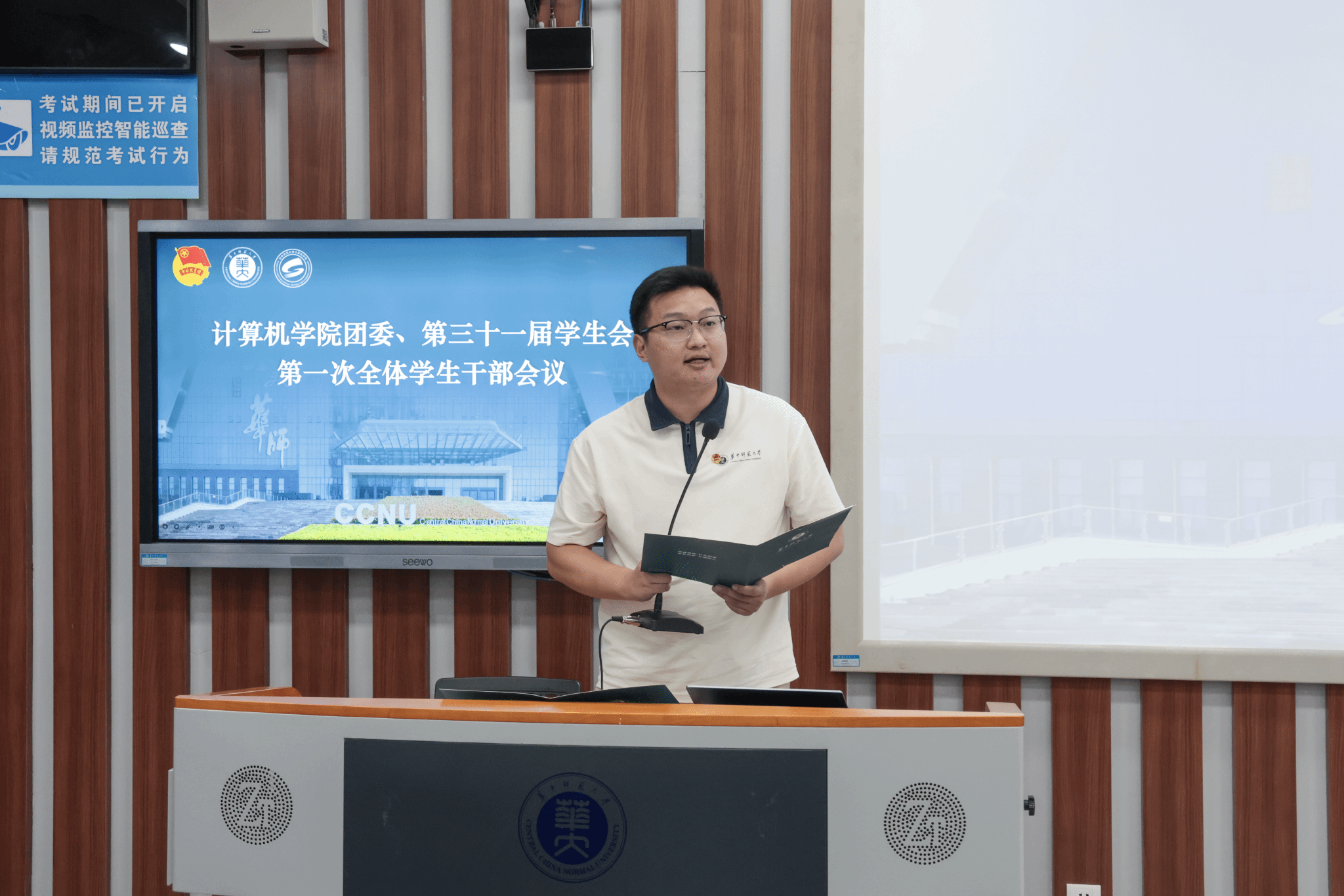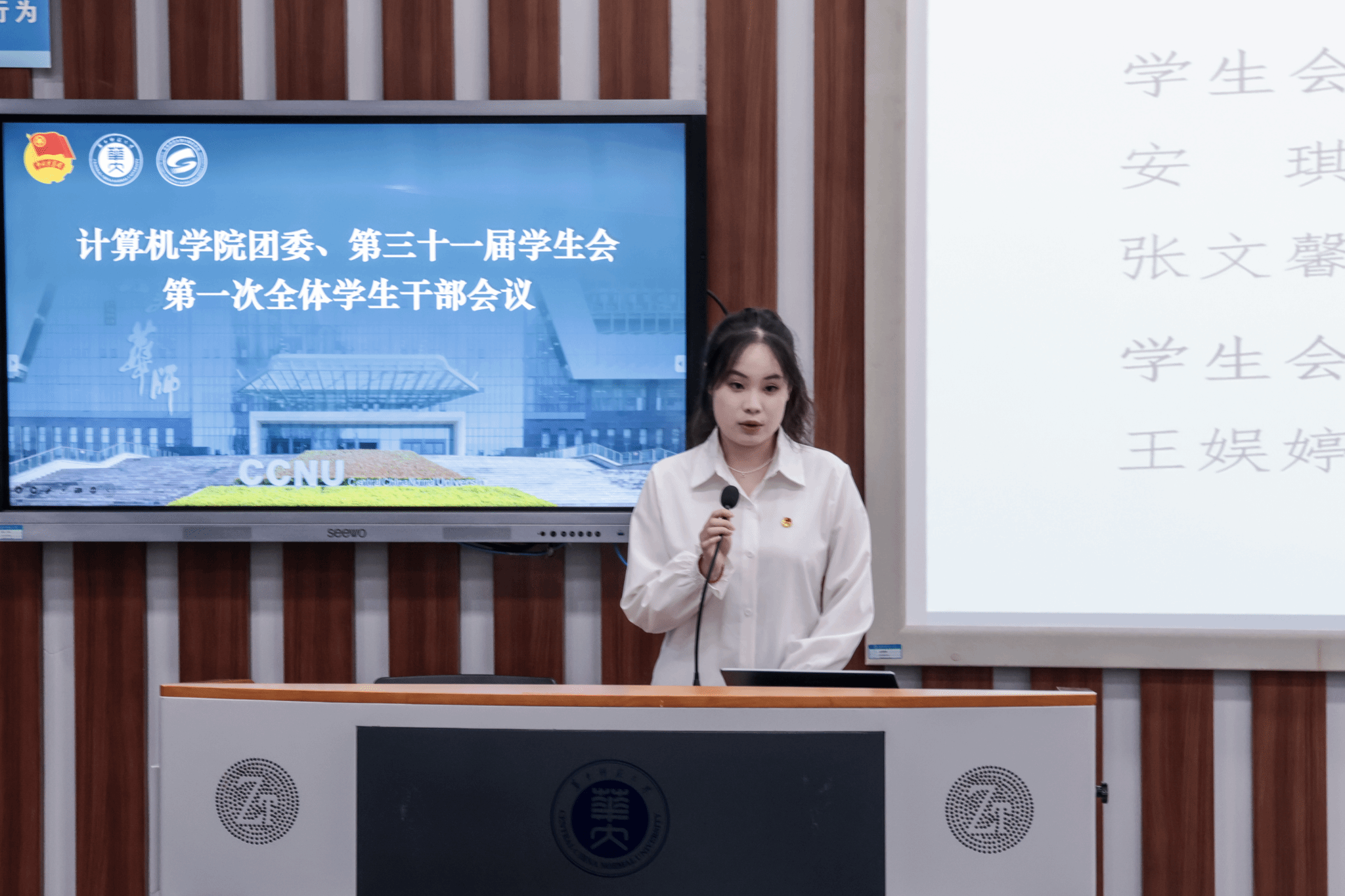 伴随庄严嘹亮的团歌声,会议正式开始。计算机学院团委副书记(学生)李逸飞、学生会主席团成员罗岳荃分别宣读团委和学生会招新名单,团委副书记(学生)余思娇、学生会主席团成员李佳乐则接续介绍本年度团委和学生会的主要工作。对职责体系与工作布局的细致介绍不仅让新成员对团学组织有了全面认知、明确了自身定位,也为后续各项工作的有序推进奠定了坚实基础。