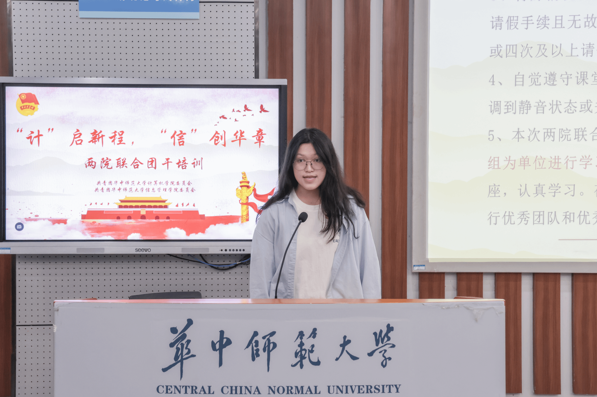 计算机学院团委副书记(学生)余思娇介绍了培训规章制度,明确考勤与考核要求,强调制度是培训质量的保障,号召学员以严谨态度完成各项任务。信息管理学院团委副书记(学生)范佳琦就培训安排作说明,鼓励学员合理规划,确保学有所获。