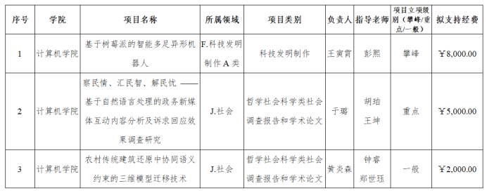本次活动由共青团华中师范大学委员会主办,各学院团委、校级学生组织实施。大赛自开展以来,得到了同学们的积极响应。经过院内选拔、校团委审核评,计算机学院共有3件作品入围华中师范大学2020“挑战杯”竞赛助推计划,统计结果如下表。