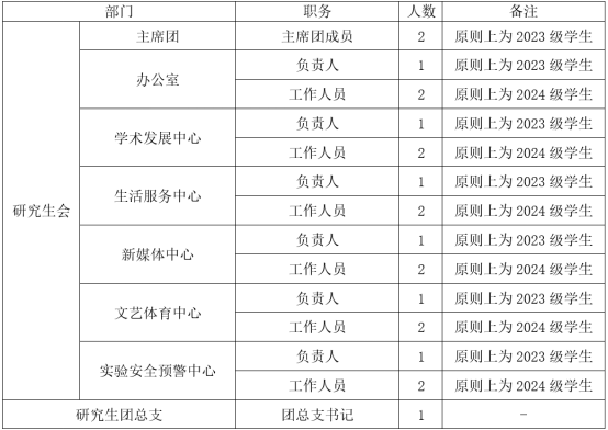 依据《中华全国学生联合会章程》《关于推动高校学生会(研究生会)深化改革的若干意见》(中青联发〔2019〕9号)《普通高等学校学生(研究生)代表大会工作规定》(中青办联发〔2021〕3号)等文件规定,拟选拔一批团结奋进、务实高效、勇于创新的同学加入到研究生会、研究生团总支中来,打造一支政治站位高、工作能力强、综合素质硬、富有实干态度、团队意识和创新精神的学生骨干队伍。现面向全院研究生选拔各部门工作人员。
