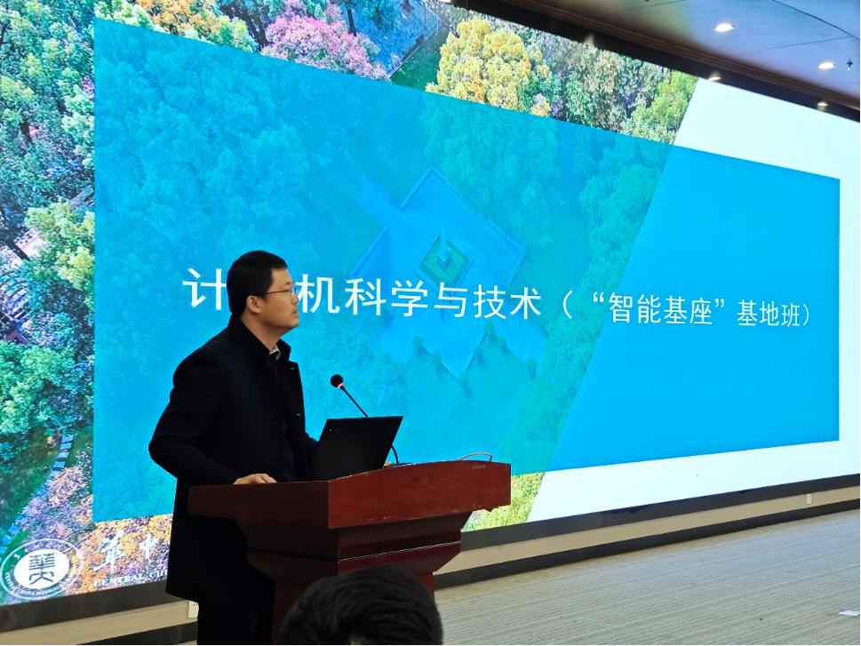 谢伟则详细介绍了计算机科学与技术“智能基座”基地班的建设背景和历史沿革,强调基地班“自主可控、卓越、拔尖创新”的人才培养目标、校企融合和以新技术培养新人才的重要性,并从联合课程开发、资源投入和制度保障三大板块深入阐述了基地班的特色与优势。最后,他以赵潇帆、李劲哲等优秀学生代表为例,生动展示了基地班在高质量人才培养方面取得的显著成果。