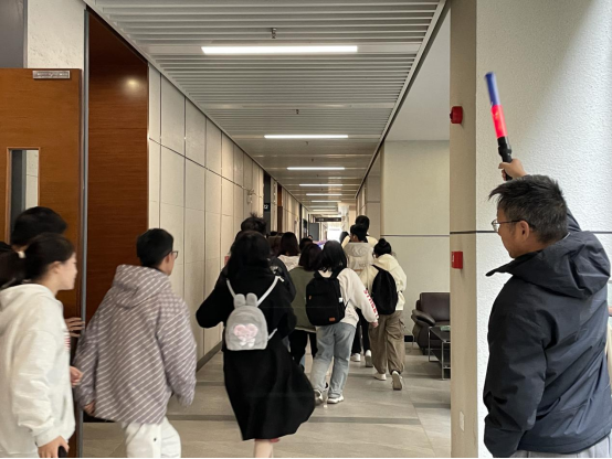 活动最后,同学们在五楼实验室进行了紧急疏散演练。同学们在计算中心教师的引导下,按照防护要领和应急预案既定疏散路线迅速向安全区域疏散,整个演练过程严谨有序。