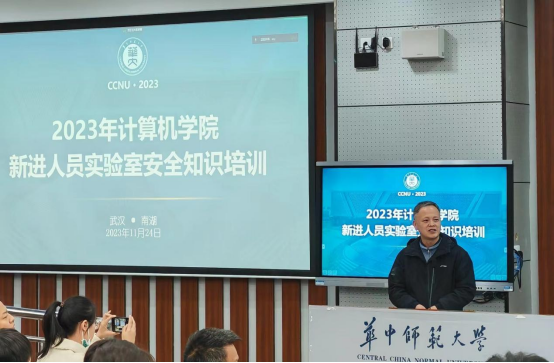 计算机学院记者团讯(通讯员 段一可)为提高实验室人员安全意识和安全技能,构建和谐平安校园,11月24日下午,由计算机学院举办的“2023年新进人员实验室安全教育”主题活动在南湖综合楼N107、N111教室展开。本次讲座邀请了计算机学院副院长刘明与实验室老师孙树园,为新生们讲解实验室安全的重要性并进行安全教育培训,活动由朱珠老师主持。