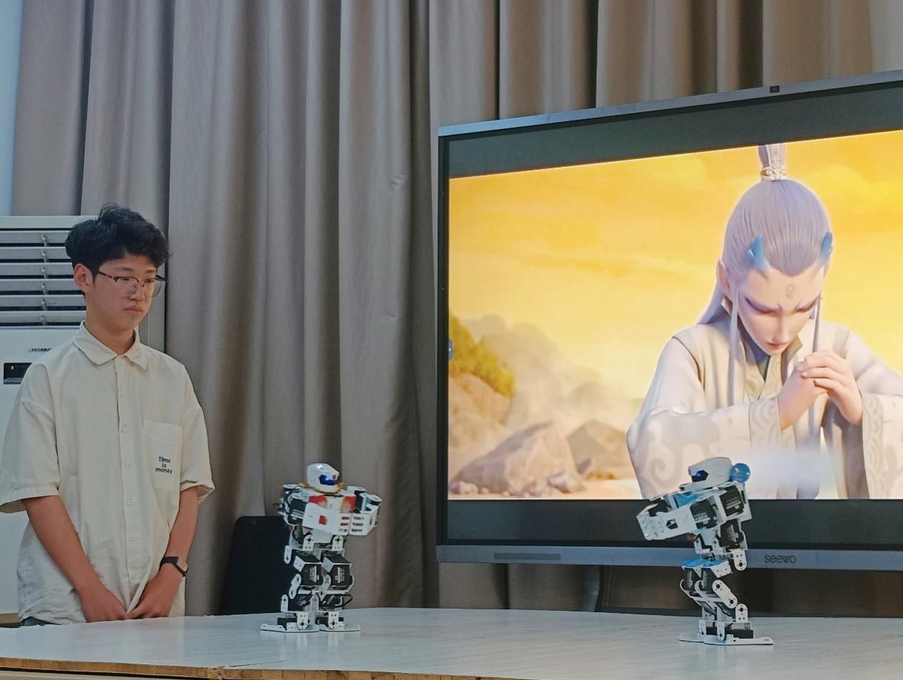 编程环节结束后,活动进入舞台剧展示环节。全体学生分为四组,以《武松醉打蒋门神》《哪吒之魔童降世》《川引禹娇》《精忠报国》为主题,将编程与机器人技术巧妙融入舞台剧创作。各小组精心设计剧情脚本,结合背景视频、现场解说,通过机器人的精准动作演绎,生动再现经典故事场景。舞台剧展示环节为同学们提供了一个展示自我、锻炼能力的平台,也让他们在实践中感受到了科技与传统文化相融合的无限可能。