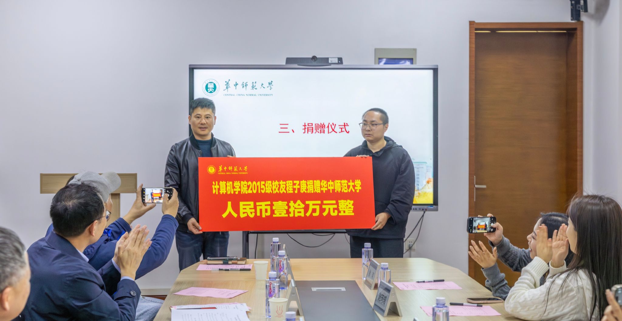 3月22日上午,华中师范大学计算机学院“程子庚校友奖学金”捐赠仪式在南湖综合楼7108会议室举行。华中师范大学计算机学院2015级校友程子庚,原团学干部徐可、赵珂瑶、刘卫晋、陈黎,教育发展基金会秘书贾世伟,计算机学院党委书记王坤,副院长刘明,教授郑世珏,辅导员董明月、赵丹、孙煜林、宗佳敏以及学生代表参加捐赠仪式。仪式由学院党委副书记庄甲鹏主持。