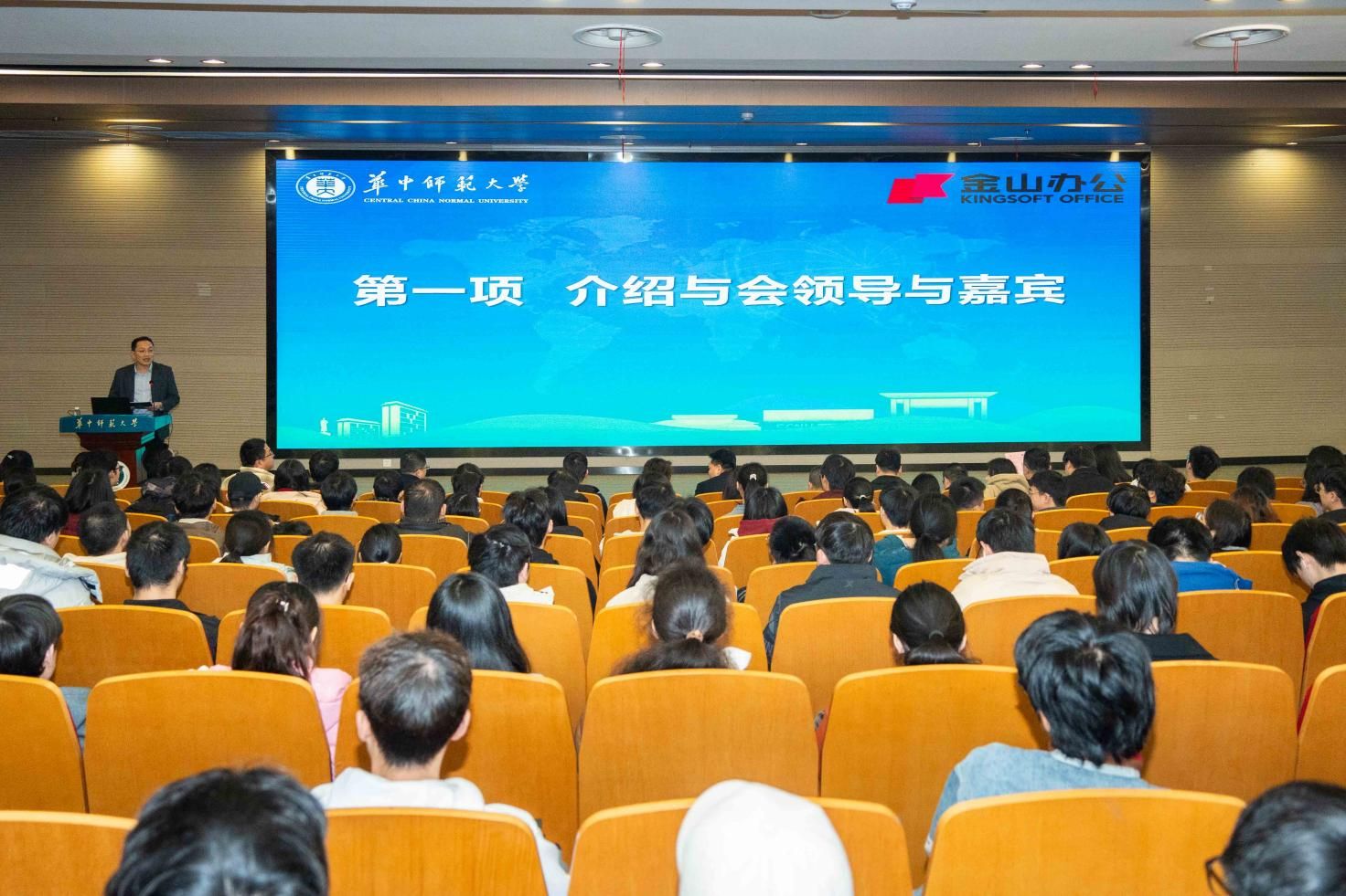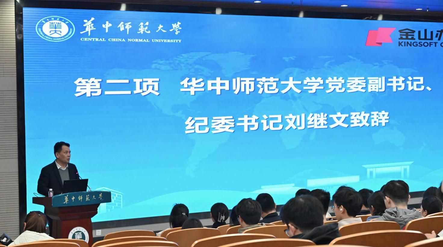 计算机学院记者团讯(通讯员 陈宇欣 郑邦芃 田俊楠 编辑 黄丝语)3月12日下午,“华中师范大学—金山办公新未来训练营”开营仪式于华中师范大学南湖综合楼一楼报告厅举行。金山办公软件科技有限公司总经理、研发培训院负责人詹欣坤,招聘总监、研发培训院总监陈志增,研发培训院副总监、技术委员会专家武海涛,研发培训院C++教学负责人陈颢文,招聘经理赵志梦;华中师范大学党委副书记、纪委书记刘继文,就业处处长游丽,计算机学院党委书记王坤,副院长谢伟,教学秘书李沛,辅导员宗佳敏、肖克、孙煜林,金山办公新未来训练营往届优秀营员代表王溦以及金山办公新未来训练营参训学员参加。计算机学院党委副书记庄甲鹏主持开营仪式。